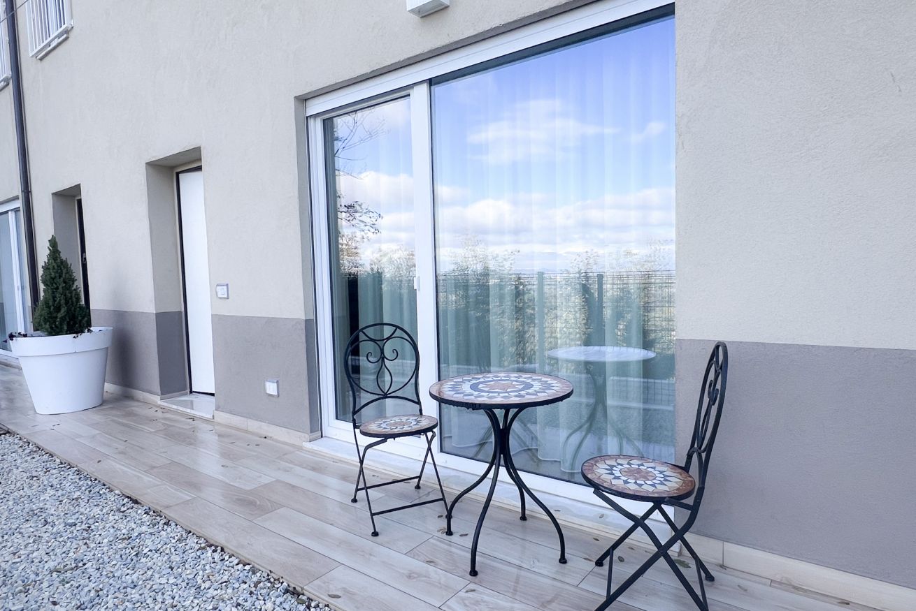 A disposizione degli ospiti anche un piccolo spazio esterno perfetto per un momento di relax, con una piacevole vista sulla campagna maceratese e sul Monte Conero.